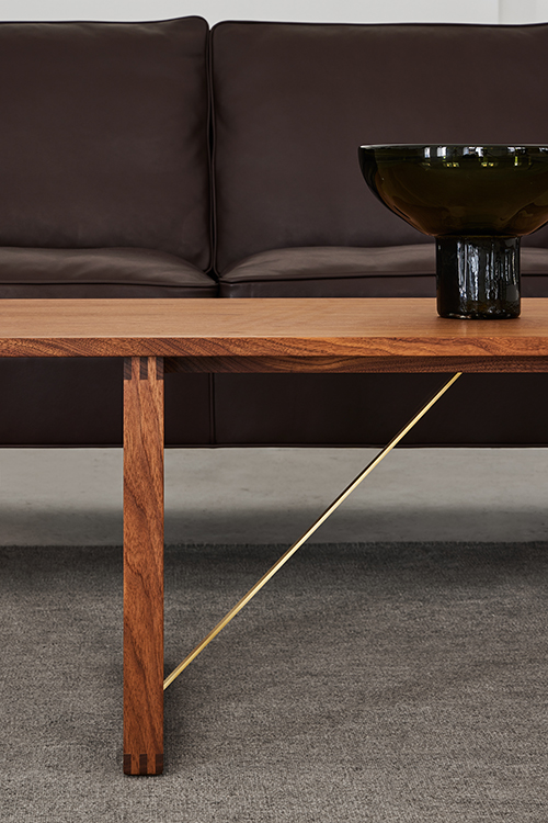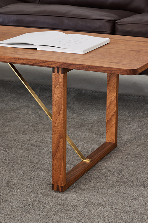 テーブルはノックダウンで、オーク無垢材またはウォールナット突板のテーブルトップと無垢材のエッジ、フレームは無垢材、ブラケットは真鍮または粉体塗装スチール製となります。