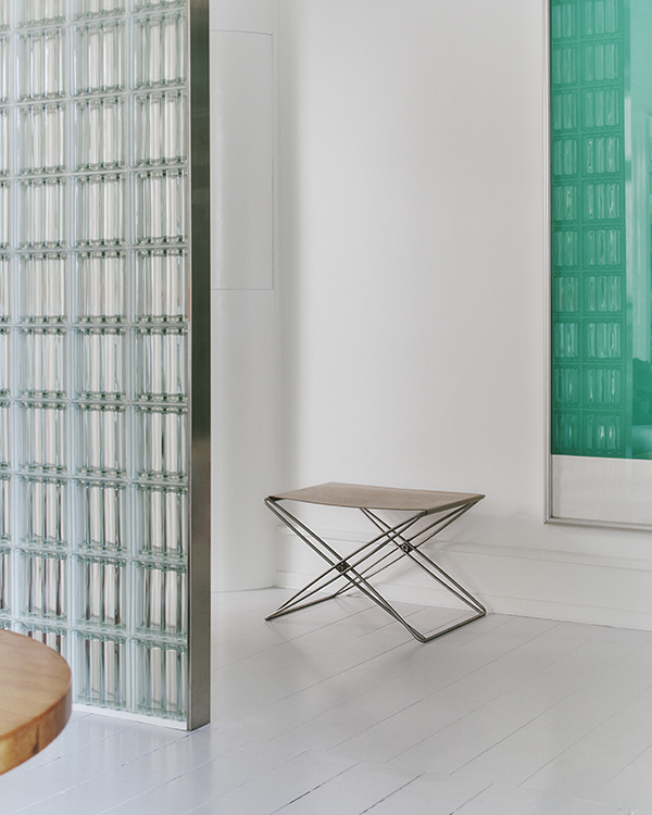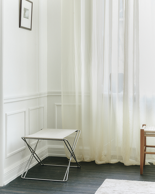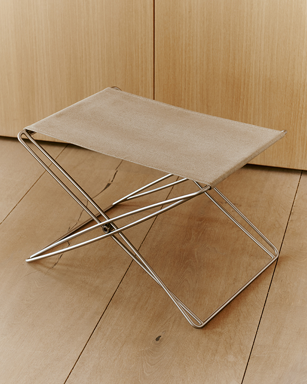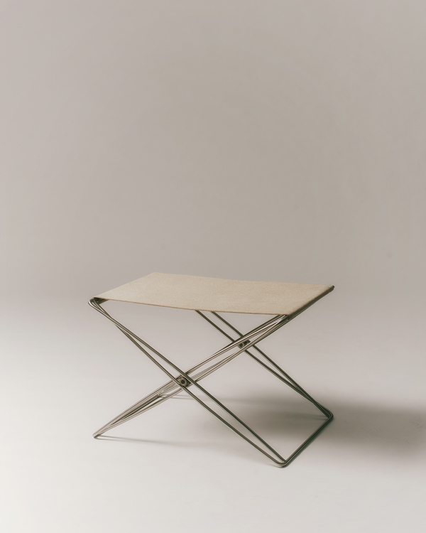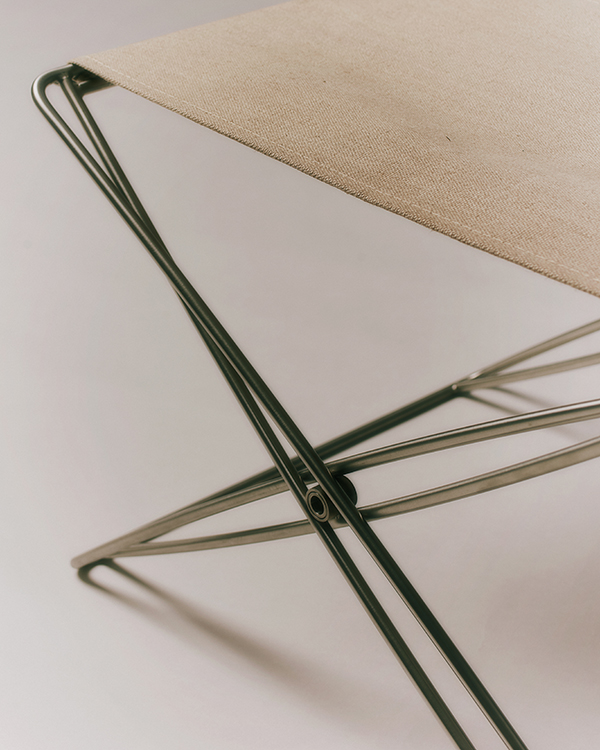 折りたたみができるステンレススチール(艶消し)のベース、座面はリネンキャンバス、またはレザーシートをお選びいただけます。レザーシートにはキャンバスの裏地が付いています。