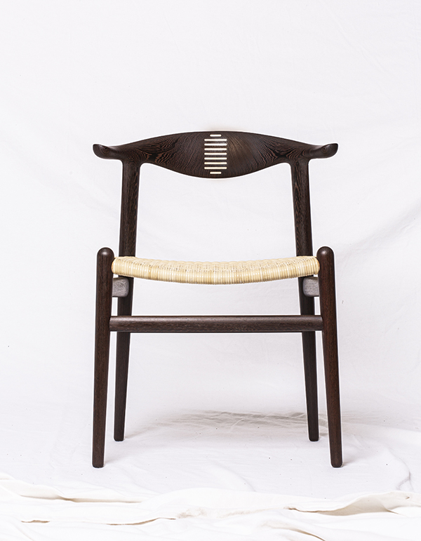 特徴的なアームレストと中央のローズウッドのジョイントが、このチェアを特別なものにしています。カウホーン(牝牛の角)チェアと名付けられた通り、大きな無垢材から削り出して完成するそのアームは角を連想させる美しさです。