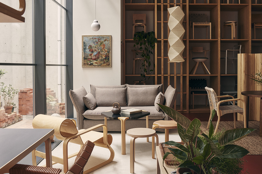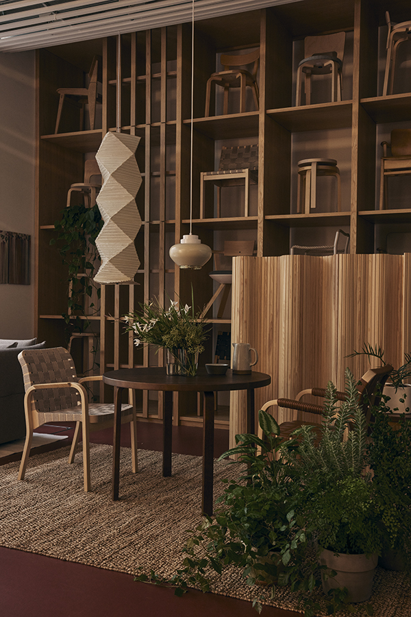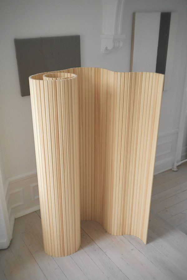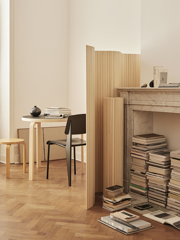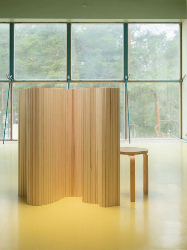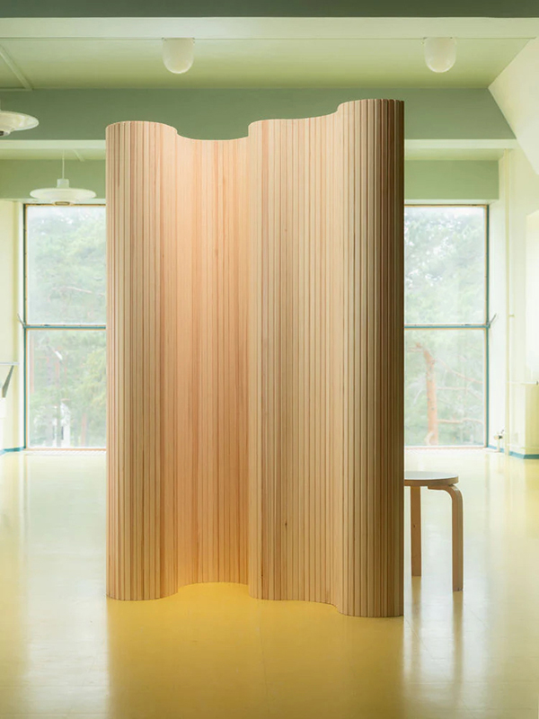 フィンランド産の細長いパイン材を垂直に連結することで、アアルトの建築にもよく使われるゆるやかな波のモチーフをパーティションとして製品化したものになります。